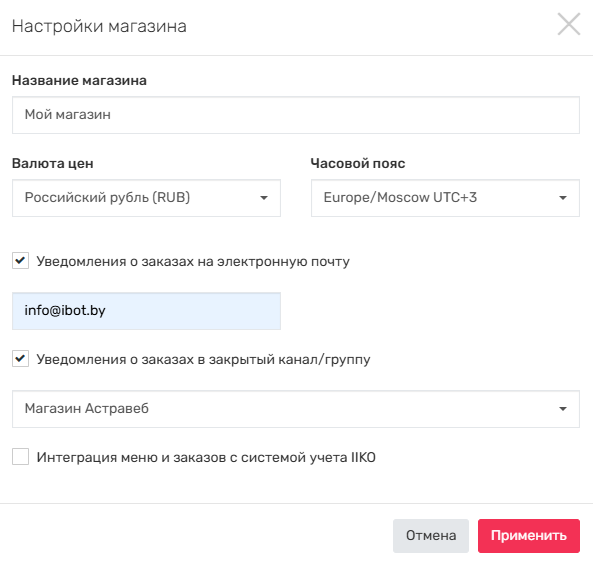 При необходимости, можно включить дублирование уведомлений о новых заказах в закрытый канал или группу. Для этого нужно назначить своего бота администратором канала/группы. После этого включить эту опцию в настройках магазина. Там же можно включить уведомления о новых заказах на электронную почту.