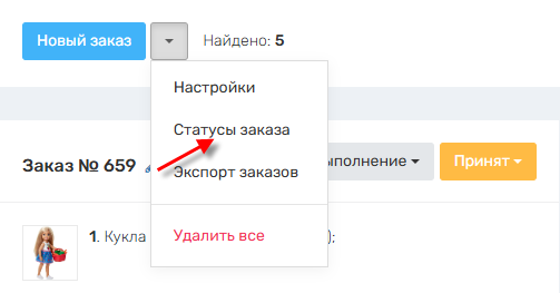 Переход к настройке статусов происходит в кабинете, в разделе «Заказы», через дополнительное меню.