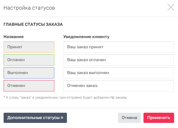 Помимо главных статусов заказа есть возможность добавить несколько своих статусов для маркировки этапов выполнения заказа.